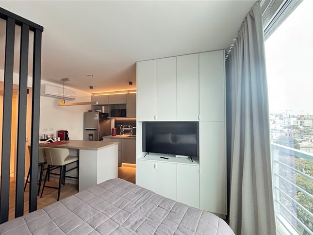 Apartamento monoambiente en venta en Edificio JOY, ubicado en el departamento de Montevideo, zona de Pocitos. Esta unidad a estrenar, construida en 2024, cuenta con 30 m² de padrón y 28 m² edificados. Se encuentra en el piso 7 y tiene una disposición lateral con orientación este. El apartamento es a estrenar, en excelente estado, y está totalmente equipado. La cocina es integrada, cuenta con muebles y placares, ofreciendo un espacio funcional y moderno. La calefacción es por aire acondicionado central, garantizando confort durante todo el año.